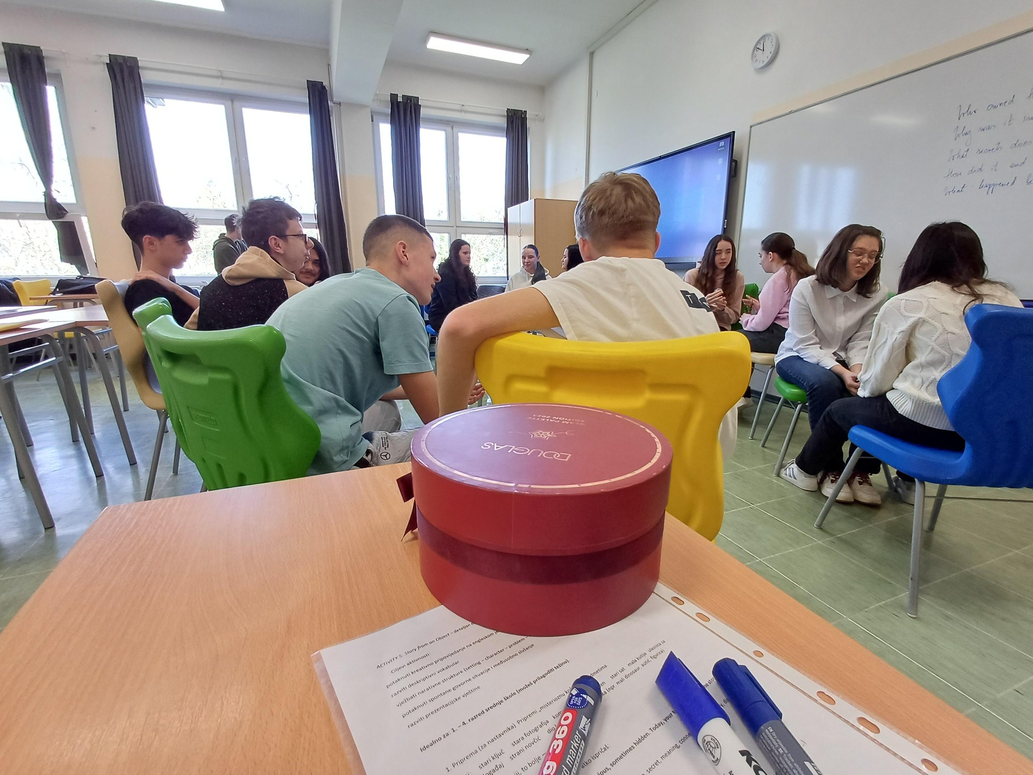 Učenici prvih razreda s nastavnicom Antoniom Varat sudjelovali su u radionicama The story behind a mysterious object gdje su vođeni uputama samostalno smišljali priče, suradnički ih dorađivali te konačno uživali u slušanju maštovitih priča svojih vršnjaka. Bilo je tu od povijesnih i romantičnih drama do trilera i horora. Učenici su smišljali i slušali neobične priče na engleskom jeziku uz puno zabave i smijeha.