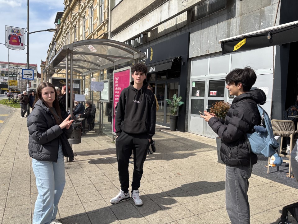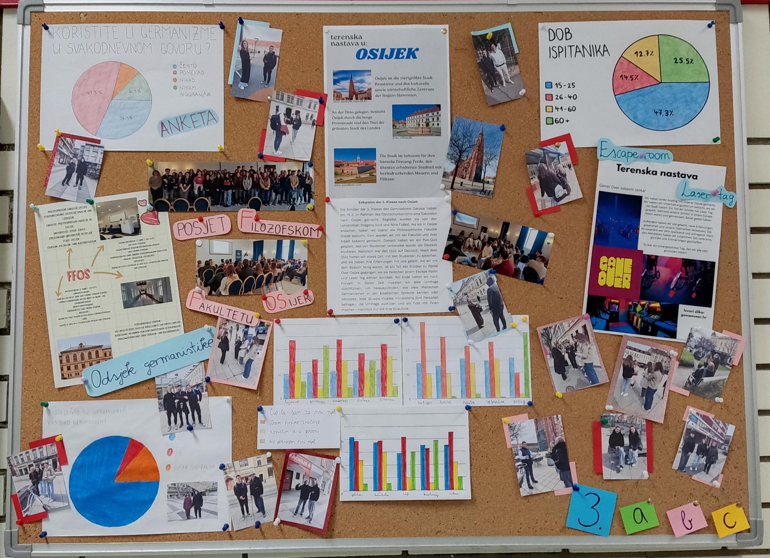 Učenici su se zatim podijelili u skupine kako bi odradili sljedeću aktivnost – anketu o poznavanju i upotrebi germanizama u hrvatskom jeziku. Dok je dio učenika provodio anketu u gradu, drugi je dio boravio u zabavnom centru Game Over, gdje su igrali laser tag ili rješavali zagonetke u escape room-u, nakon čega je uslijedila zamjena skupina. Na taj su način učenici uspješno spojili rad i zabavu te imali priliku samostalno organizirati svoje slobodno vrijeme.