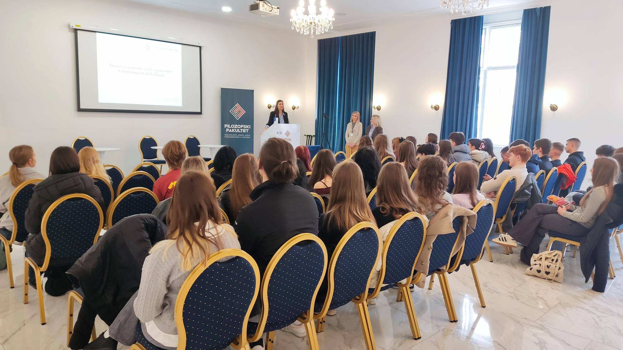 Naši učenici trećih razreda 18. ožujka 2026. godine boravili su u Osijeku u sklopu terenske nastave iz njemačkog jezika. Najprije su posjetili Filozofski fakultet, gdje su poslušali kratko predavanje o samom fakultetu, kao i o studijskim programima i mogućnostima koje nudi studentima, s posebnim naglaskom na studij germanistike.